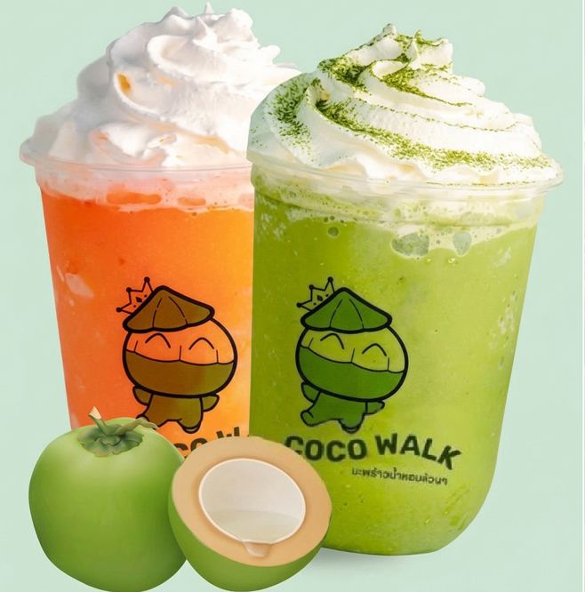 จำหน่าย น้ำมะพร้าวแท้ 100% หรือ มิกซ์กับผลไม้อื่นๆ อาทิ น้ำมะพร้าวมัจฉะ น้ำมะพร้าวกาแฟ น้ำมะพร้าวปีโป้ น้ำมะพร้าวโอริโอ น้ำมะพร้าวครีมชีส และน้ำลำไย